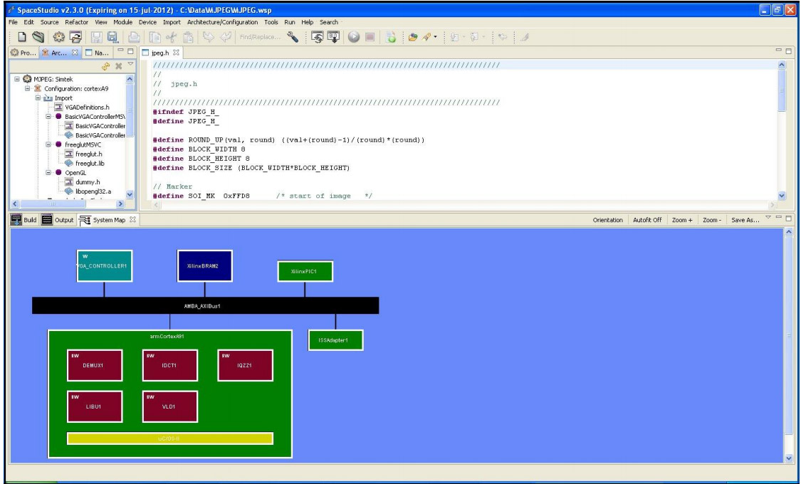 - 次にプロセッサ、バス等、実現したいアーキテクチャを決め、アプリケーションをマップします。(この時点では、まだC/C++/SystemCを使用)