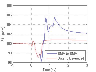 The SMA and lead-in traces are de-embedded with the same exact differential impedance from DUT + test fixture in 4-port VNA measurement, as shown below in time-domain differential impedance profile.
