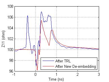 The non-causal response after TRL, which is attributed to the impedance variation between TRL calibration board and actual DUT test fixture, is clearly seen in the following figure. ISD is free of causality error. Note the big difference in return loss, too.