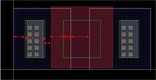 參數化單元版圖的自動生成工具,提供比主流EDA工具版圖形式更加靈活的參數化單元自動生成工具,可描述任意複雜的版圖結構並定義任意形式的參數變化。(下圖中的紅色箭頭距離均可作為參數進行自由組合變化)。